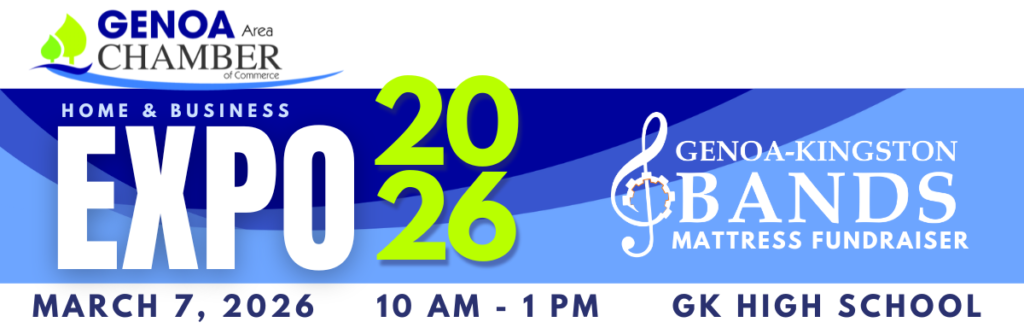 Join the Genoa Area Chamber of Commerce for the return of our Home & Business EXPO! Visit with local businesses and nonprofits. Enter for a chance to win a door prize! This year we’re partnering with the GKHS Band Mattress Fundraiser – they will have their sale in the commons and the Expo will take place in the gym as usual! Back by popular demand, the Taste of Genoa where you can sample food or drinks from local restaurants, bakeries and vendors! We can’t wait to “COGnect” with you again!